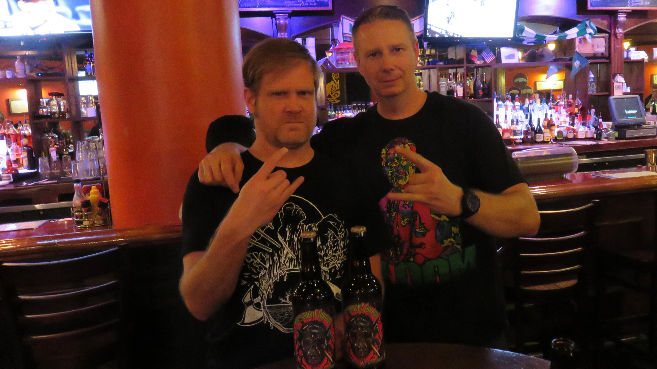 Will said he was on the second floor, so we climbed the stairs and found him at a table near the bar. Will was scheduled to meet with Blake Harrison of Hatebeak and Pig Destroyer. Will is hoping to brew a beer for Hatebeak and wanted to pick Blake’s brain. Blake was also bringing Will a few bottles of 3 Floyd’s Brewing’s Permanent Funeral, which was brewed for Pig Destroyer (Will’s BREWHEAD review to follow…)