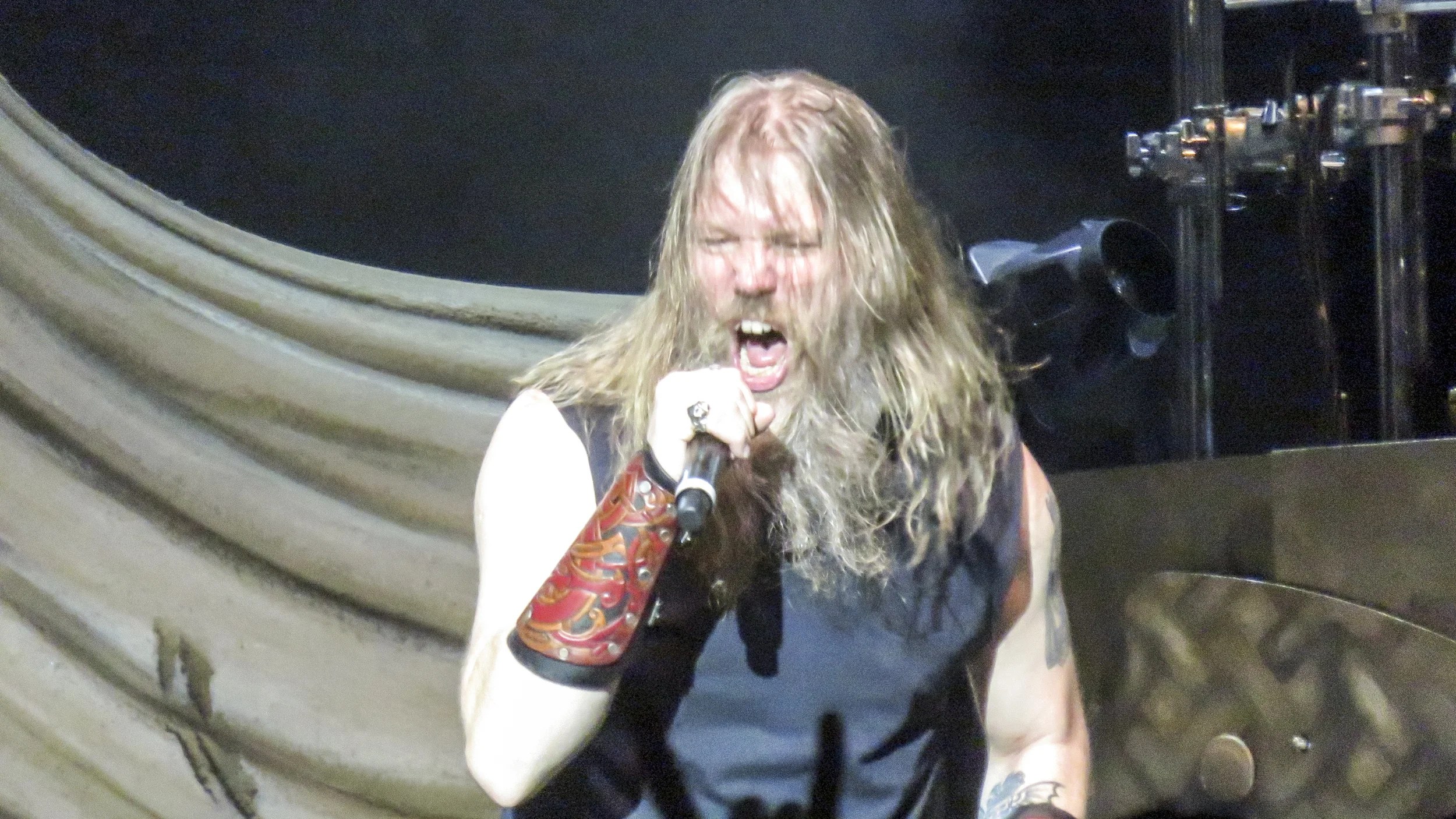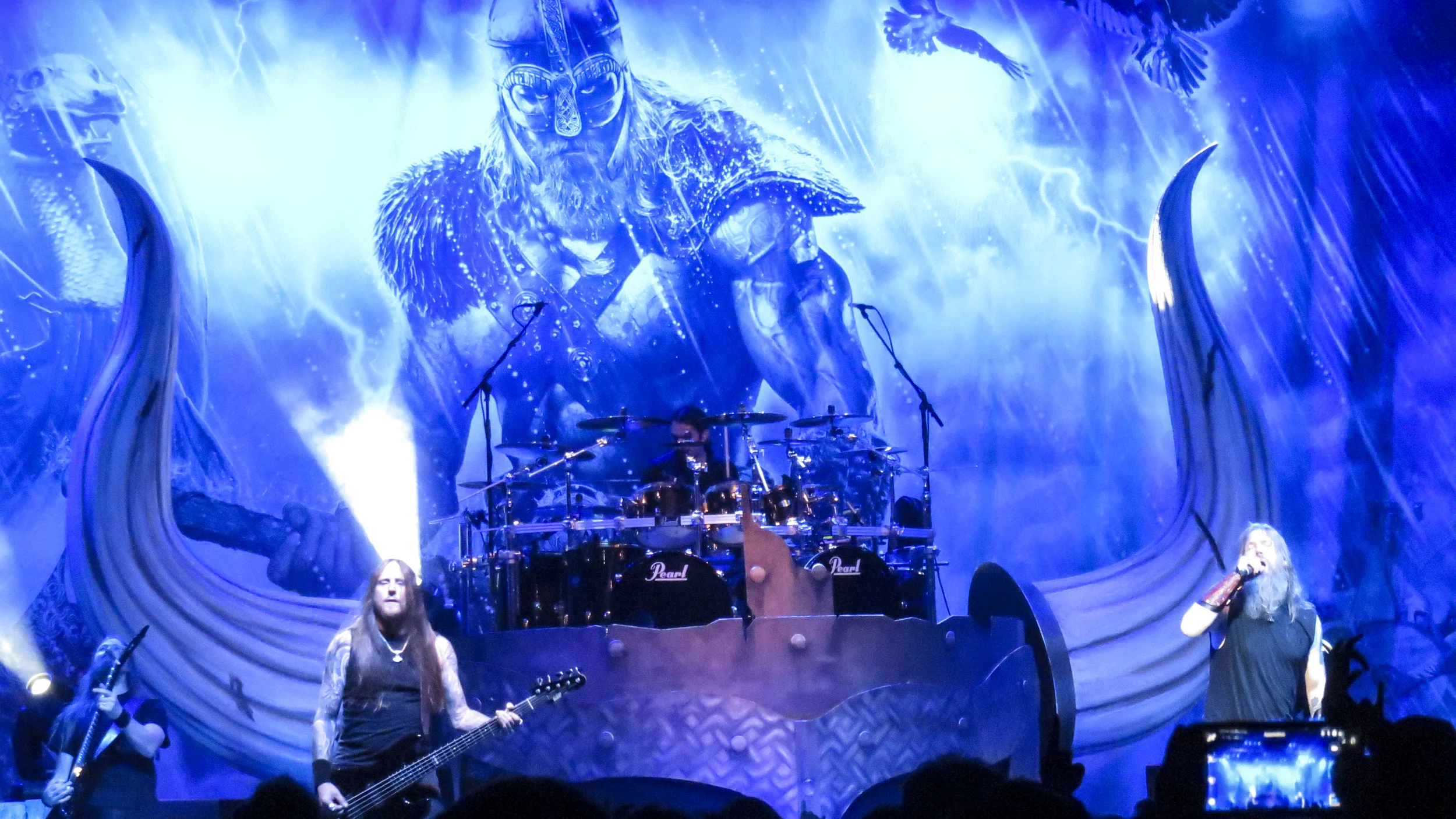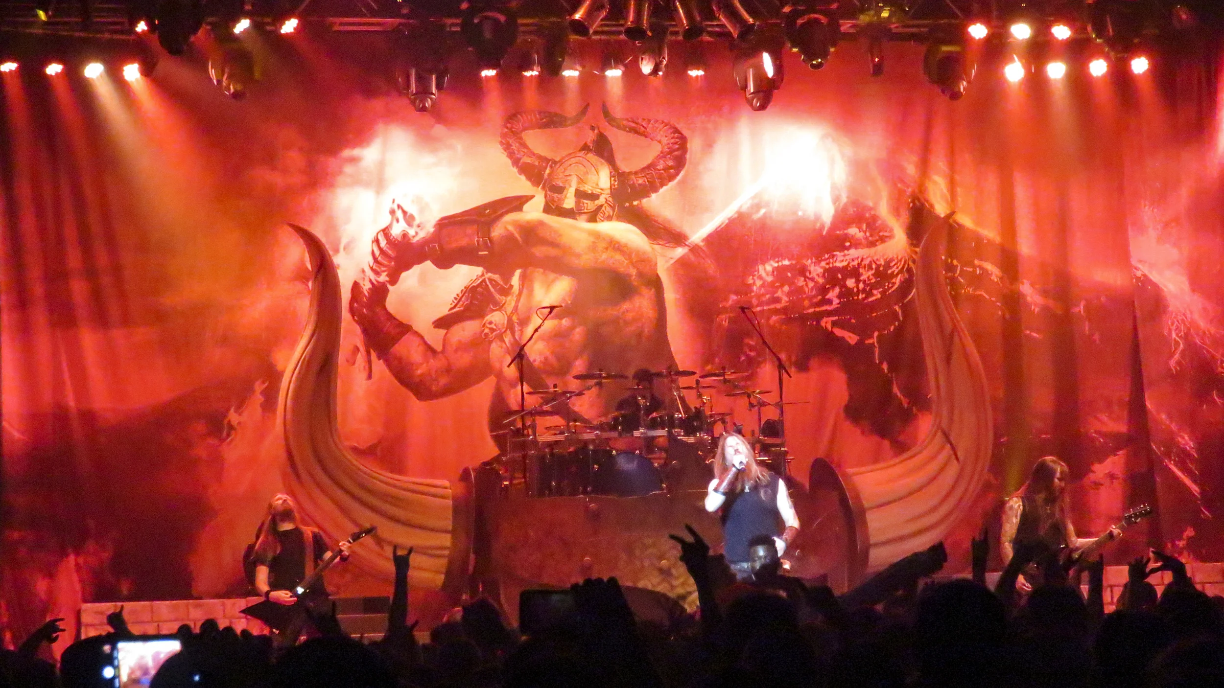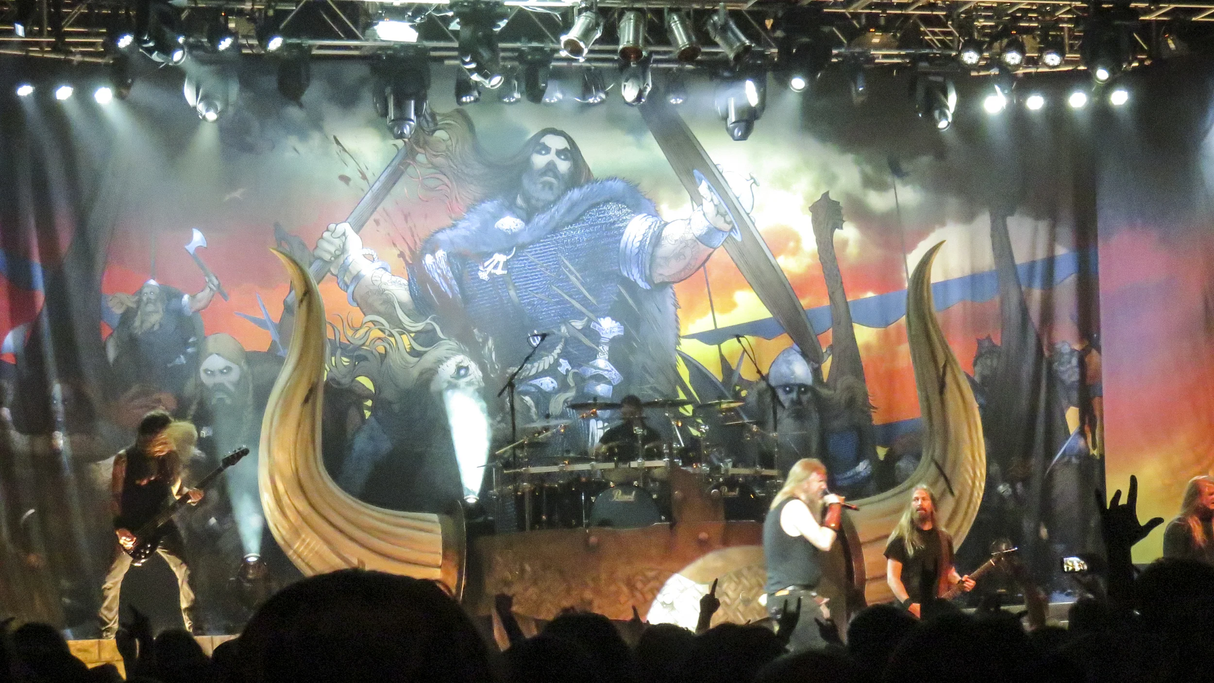 Finally, it was time for the headliner, Amon Amarth, to take the stage. We could see that there was something large underneath a lot of black sheets on the stage. Obviously, it was some large drum riser. Based on the shape underneath I speculated that the drums would sit in the middle of a large dragon ship. I was wrong, however, as when all was revealed it turned out to be a giant horned Viking helmet…with the drums in the middle. I am no historian, but I thought I had read at some point that Vikings never actually wore helmets with horns on them, at least not enough so that it should be considered typical. Since Amon Amarth are a Swedish band, I expect they are fully aware that this is simply a stereotype perpetuated by too many Hollywood movies, so I am a little surprised they would use something so historically inaccurate. On the other hand, they are entertainers and probably want to give the people what they are expecting, reality be damned.